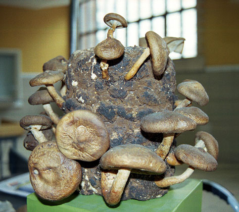 Shitake Mushrooms growing on an oak log