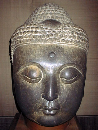 A carved Buddha head larger than a man