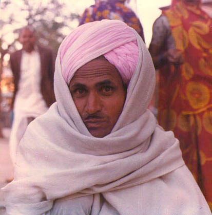 | Location: Jaisalmer India A man on a Rajastani street corner. In Jaisalmer brightly-coloured turbans and intricate sandstone carvings make a rich counterpoint to the usual monotony and bleakness of barren desert terrain. |