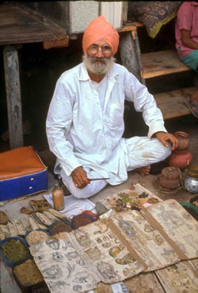 | Location: Punjab India A street vendor of Ayervedic Medicines The tumult in the bazaar seems to go on at an unaltered pace day and night....I am surrounded by the intense smells of sandalwood curry mango papaya and incense |