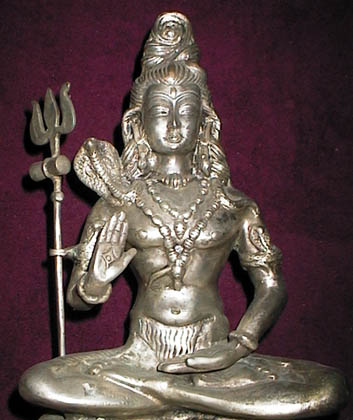 A statue of Lord Shiva sitting in meditation next to his trademark trident. Shiva represents one of the three aspects of God