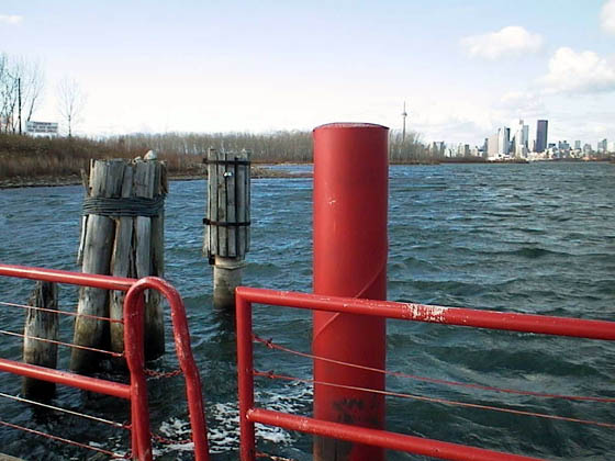 | Location: Toronto Canada On the Pontoon bridge in the park. With the Toronto skyline far in the distance the pontoon bridge in Tommy Thompson Park sways back and forth in the waves. |