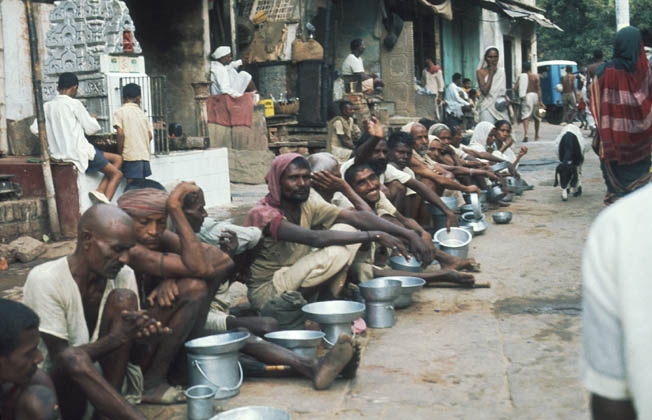 | Location: Benares India A long line of beggars en route to the Ganges Lining every street that leads to the sacred river is a line of beggars hoping for alms from the pilgrims who have come here on their spiritual journey |