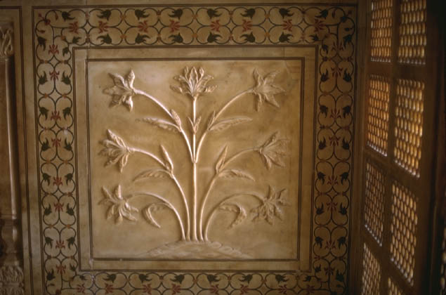 | Location: Agra India A closeup of a carved panel in the Taj Mahal The interior of the Taj Mahal is richly adorned with marble carving inlaid mosaics and lattice work. It took 20000 men 22 years to build the Taj Mahal. |