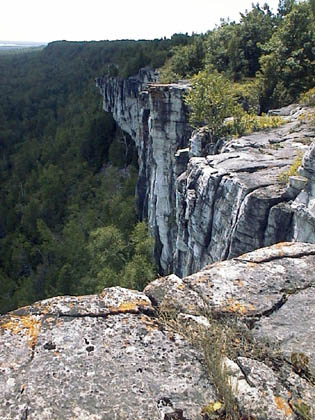 | Location: Manitoulin Island Ontario The cliff face rises from the forest floor Walking along the forest at the edge of the cliff. There are many lookout points along the trail where you can gaze on the forest far below you. |