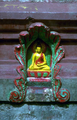 | Location: Swayambu Nepal A tiny Buddha statue decorating a stupa Buddhist shrines are richly adorned with carved statues of the Buddha; Prayer wheels; Mantra carved into stone walls and other sacred decorations |