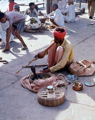 | Location: Bombay India A snake charmer amuses the crowd in Bombay A streetside performance by a snake charmer amuses a crowd of onlookers. The cobra can't hear the music-it is totally deaf. It follows the movement of the end of the flute. |