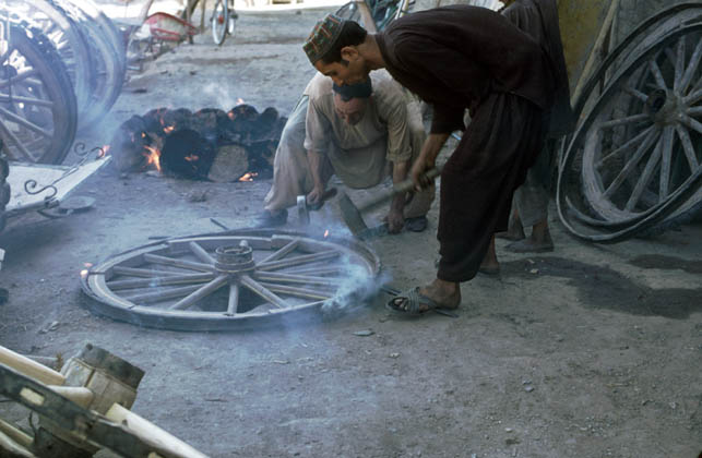 | Location: Herat Afghanistan Two wheel smiths repairing a Buggy wheel Traditional crafts such as wheel making are the core of the Afghani business world. These men are making a new wheel for a horse-drawn buggy. |
